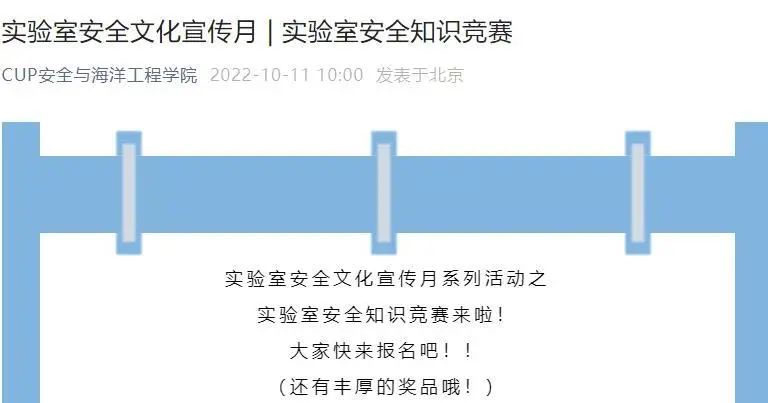 為貫徹落實黨中央、國務院、教育部關于安全工作的決策部署,以更高標準、更嚴要求、更實作風,全力以赴抓好實驗室安全工作,10月,中石大開展“實驗室安全文化宣傳月”系列活動,在2022級新生入校后這個時間節點,通過一系列宣傳教育活動建設實驗室安全文化,提升師生安全素養,牢固樹立實驗室安全理念。