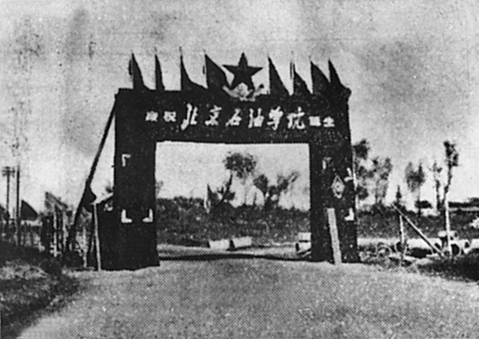 卡車奔馳在長安街上,經西單,約40分鐘到學院門口,便駛入用木板條搭起的簡易門樓,門樓上隆重地寫著“北京石油學院歡迎您”!