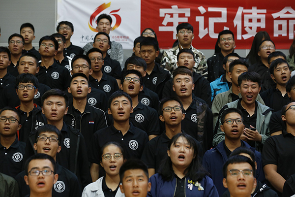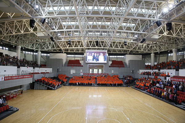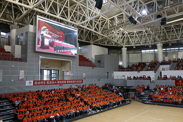 在這個特殊的日子,克拉瑪依校區組織全校師生在體育館集體觀看大會直播。同襄盛舉,共譜新章,共同祝福石大65周年華誕。