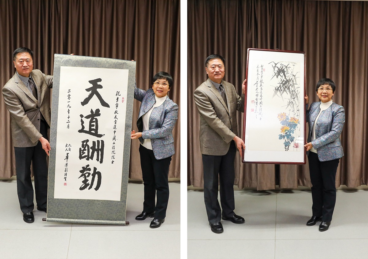 90歲高齡的華澤澎教授和82歲的余世誠教授,得悉三位校友當選院士的喜訊后非常高興,提筆潑墨為三位院士分別題字作畫。山紅紅向三位院士贈送了書畫作品。