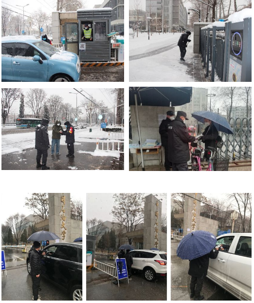 二月份,幾場雨雪天氣來襲,給校園防疫工作增加了挑戰。但是寒冷的天氣擋不住保衛人的斗志,保衛干部與隊員們一起堅守在校門口,冒著雨雪,迎著冷風,清掃積雪,對進出人員車輛進行檢查,在風雪中守護著校園進出的每一道關卡。