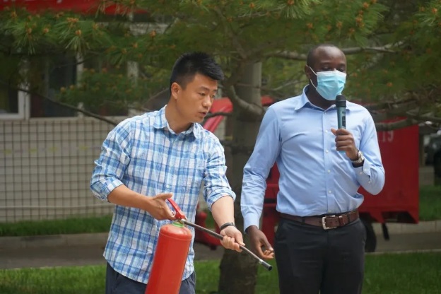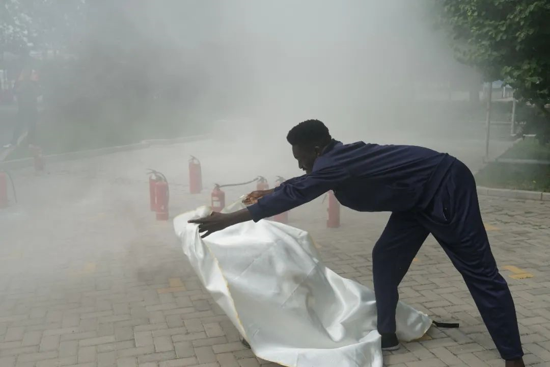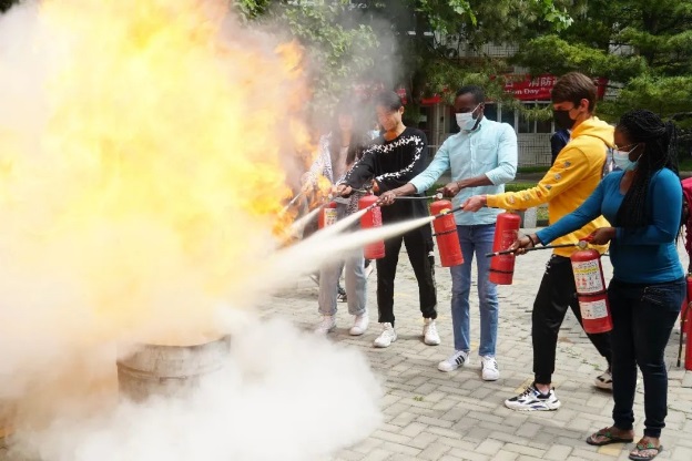 演練結束后,保衛處工作人員現場講解、示范并指導留學生使用滅火器、滅火毯,進一步強調了學生公寓的日常消防安全注意事項。
