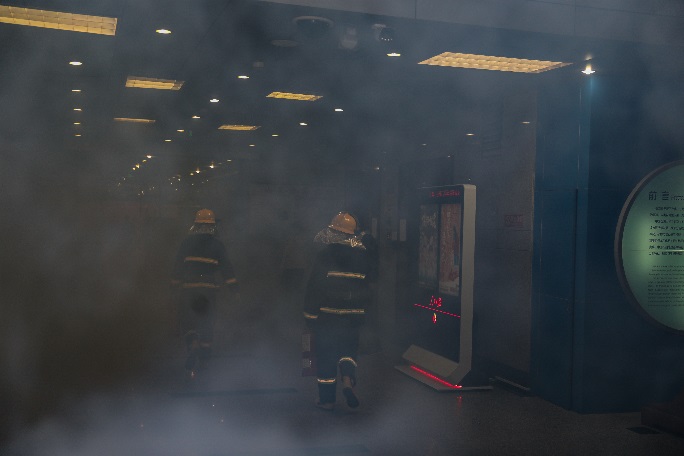 演練現場煙霧滾滾,觸發感煙探測器報警,學校中控室接警確認火情后立即啟動火災應急處置預案,啟動地質樓消防聯動設備,疏散引導組立即打開地質樓所有疏散門,引導組織樓內師生疏散至安全區域集合。