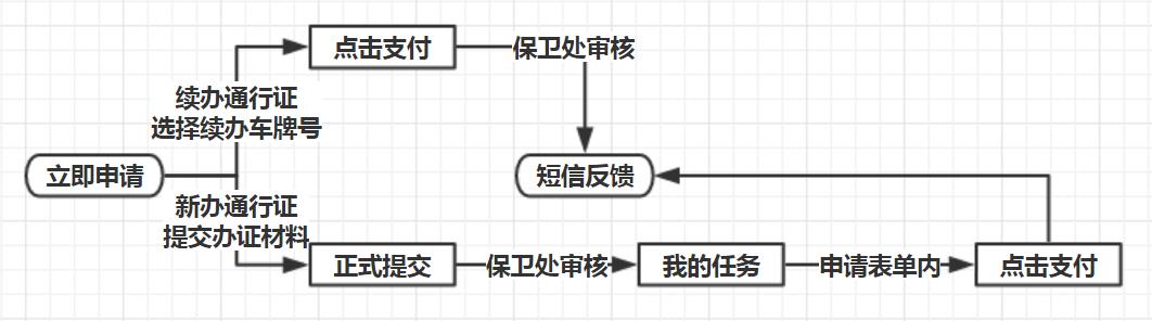 “辦理業(yè)務(wù)”選擇“新辦通行證”,完善信息并提交辦理材料,由保衛(wèi)處審核后再繳費(fèi)。
