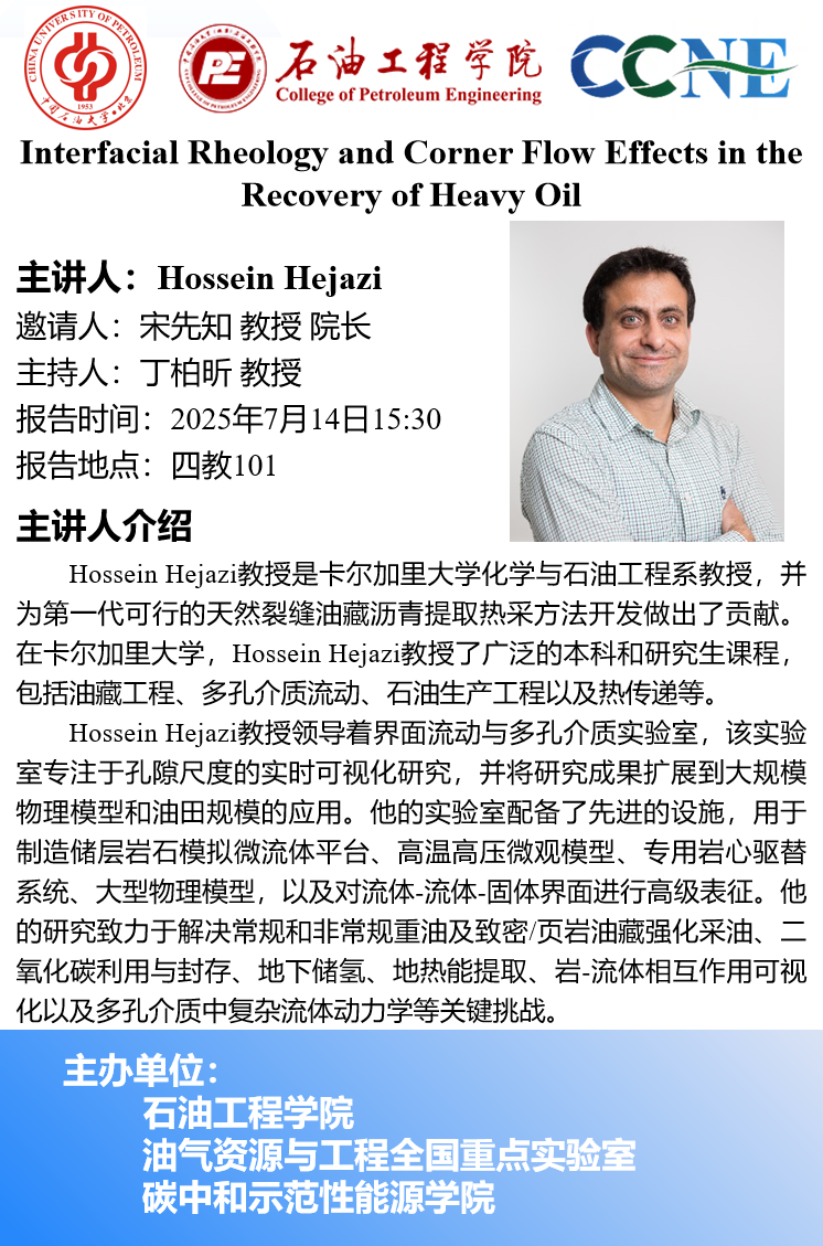 Hossein Hejazi教授領(lǐng)導(dǎo)著界面流動與多孔介質(zhì)實驗室,該實驗室專注于孔隙尺度的實時可視化研究,并將研究成果擴(kuò)展到大規(guī)模物理模型和油田規(guī)模的應(yīng)用。他的實驗室配備了先進(jìn)的設(shè)施,用于制造儲層巖石模擬微流體平臺、高溫高壓微觀模型、專用巖心驅(qū)替系統(tǒng)、大型物理模型,以及對流體-流體-固體界面進(jìn)行高級表征。他的研究致力于解決常規(guī)和非常規(guī)重油及致密/頁巖油藏強化采油、二氧化碳利用與封存、地下儲氫、地?zé)崮芴崛 r-流體相互作用可視化以及多孔介質(zhì)中復(fù)雜流體動力學(xué)等關(guān)鍵挑戰(zhàn)。