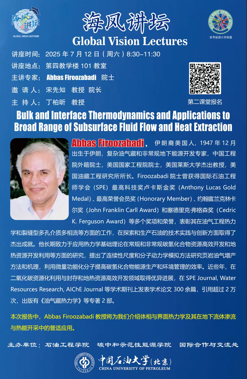 作為教育部與國家自然科學(xué)基金委員會聯(lián)合主辦的“全國研究生暑期學(xué)校”核心板塊,本次特邀中國工程院外籍院士、美國國家工程院院士、萊斯大學(xué)Abbas Firoozabadi 教授與卡爾加里大學(xué)Hossein Hejazi 教授開設(shè)專題課程,深度解析熱力學(xué)理論與界面力學(xué)理論在地下能源開發(fā)中的創(chuàng)新應(yīng)用,賦能油氣工程、地?zé)豳Y源開發(fā)和CO2 地質(zhì)利用與封存核心技術(shù)突破。
