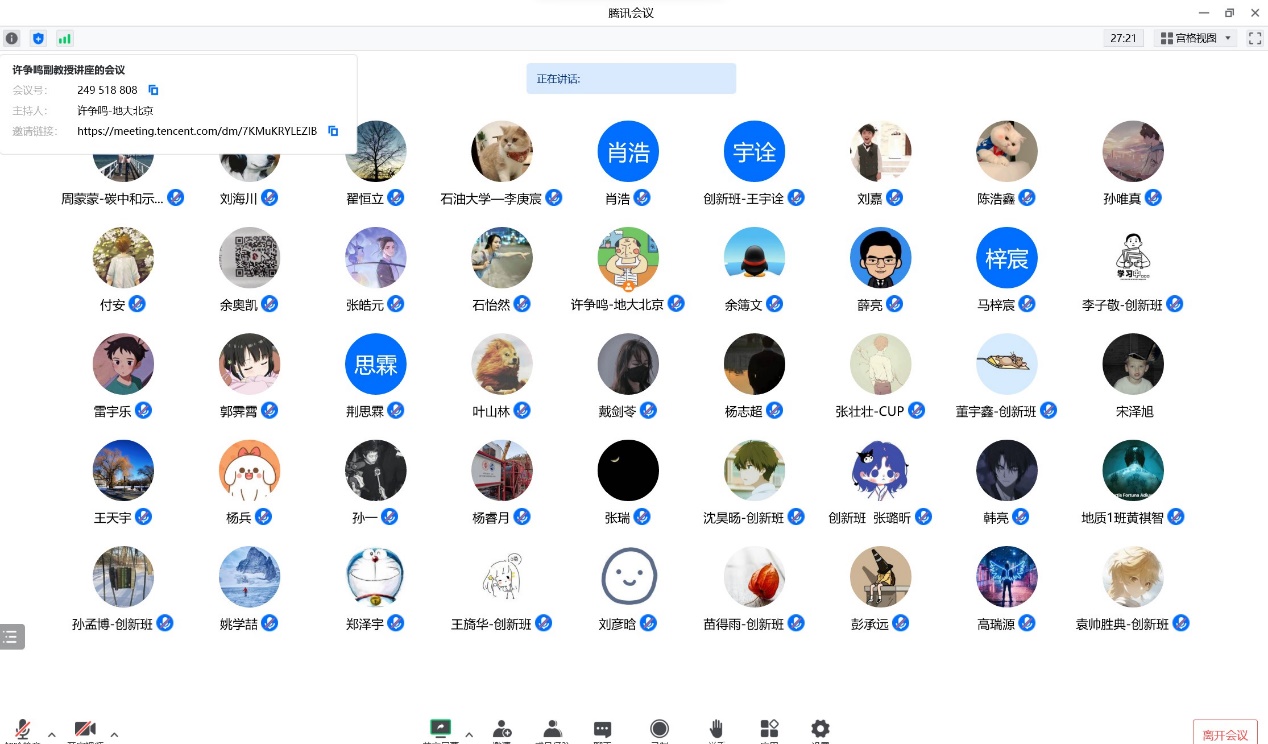 2022年11月10日,碳中和示范性能源學院周蒙蒙副教授和武曉光講師共同邀請中國地質大學(北京)許爭鳴副教授,通過騰訊會議分享了精彩的學術報告——《大位移水平井井眼井筒清潔理論及技術》。