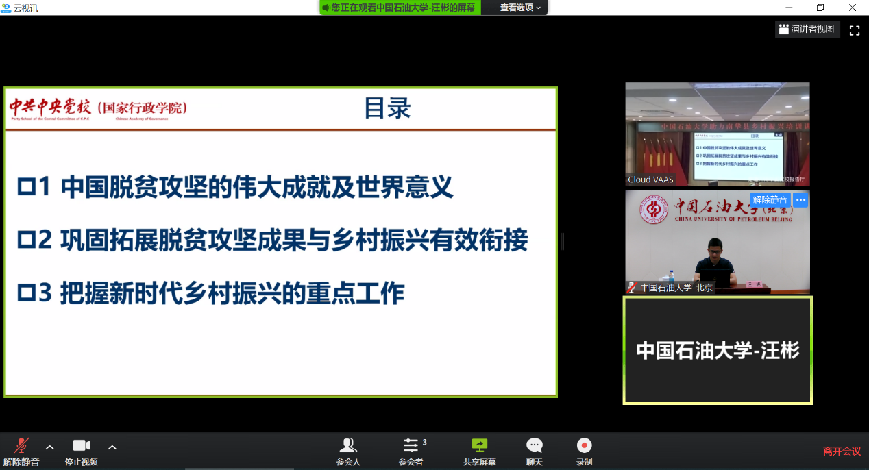2021年是中央實現(xiàn)鞏固拓展脫貧攻堅成果同鄉(xiāng)村振興有效銜接過渡期的第一年,本期專題講座也是我校助力南華縣鄉(xiāng)村振興2021年系列培訓之一,將助力南華縣領導干部綜合素質的提升,為南華縣全力打造鞏固拓展脫貧成果同鄉(xiāng)村振興有效銜接示范樣板提供堅強的組織保障。據(jù)悉,為了全面落實習近平總書記關于鄉(xiāng)村振興戰(zhàn)略的指示,后期學校還將開展南華縣干部鄉(xiāng)村振興專題培訓班,進一步為南華縣加快推進鄉(xiāng)村振興做出應有的貢獻。