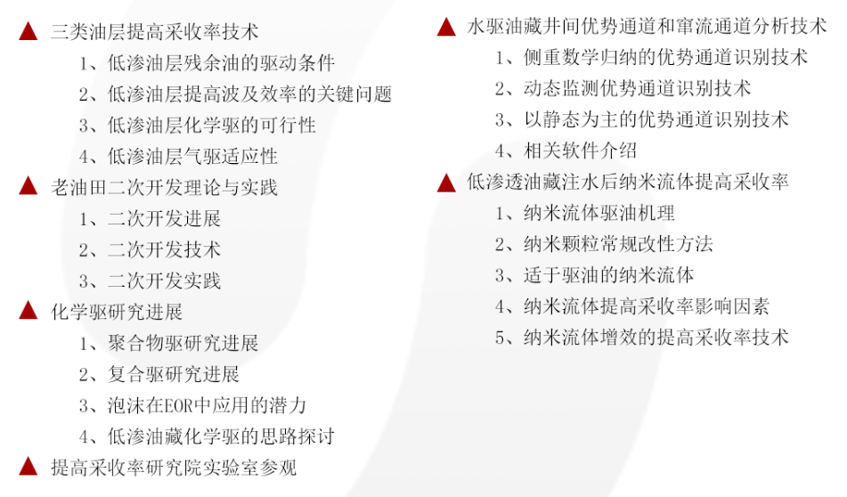 通過行業專家及高校教授10天的講授,培訓學員廣泛深入的學習中石油、中石化、高研院校等單位在三次采油及提高采收率的新方法、新技術,進一步解放思想、拓寬思路,適應新形勢下大慶油田持續穩產及提質提效的要求。