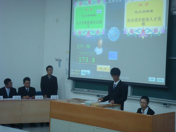 2011年10月12日晚,“化工學院辯論賽-看我七十二辯”在三教306圓滿落幕。上屆“優秀辯手”的李建建、袁琳、鄭達等擔任這次比賽的評委。辯論雙方是化工卓越班和化工創新班,分別是持“人才發展促進社會進步”觀點的正方和持“社會進步促進人才發展”觀點的反方。