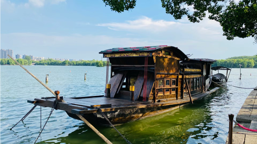 下午,實踐團成員在會景園乘船來到了湖心島。順著小道階梯一路下行,來到岸邊,便見到了停泊在湖邊的充滿歷史氣息的紅船遺址。停靠在南湖湖畔邊的紅船像是一位飽經風霜而依舊屹立的革命志士,見證了中國革命命運的歷史時刻。在這里,大家飽覽建黨偉業,再一次感受到了“紅船精神”的熏陶,心中涌起無盡的崇敬之情。接著,梁碩老師帶領實踐團成員合唱了原創歌曲《啊!紅船》,用歌聲傳遞紅船情,表達對中國共產黨輝煌歷程的紀念。激昂的旋律在湖面上回蕩,仿佛帶領大家回到了百年前的那個時空,與這條小船進行著對話,實現了百年文化的交融。一艘小小的紅船,承載人民的重托,民族的希望,在103年后的今天,已成為領航中國行穩致遠的巍巍巨輪。