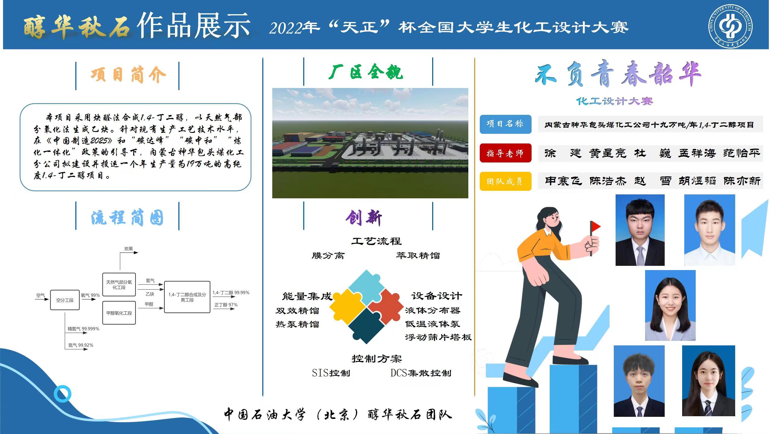 在“雙碳”戰(zhàn)略背景下,“醇華秋石”團(tuán)隊(duì)采用炔醛法合成1,4-丁二醇,以天然氣部分氧化法生成乙炔,擬在內(nèi)蒙古神華包頭煤化工分公司投運(yùn)一個(gè)年生產(chǎn)量為19萬噸的高純度1,4-丁二醇項(xiàng)目。