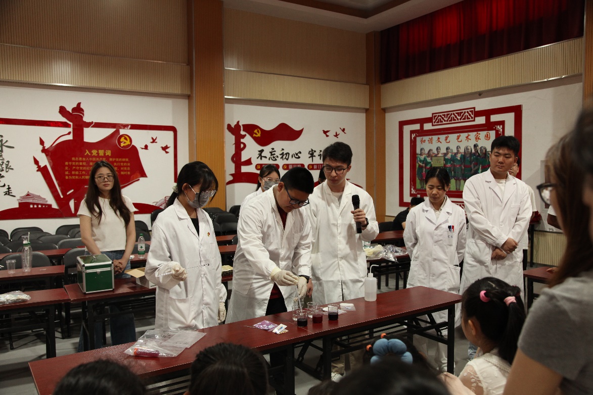 學生黨員帶小朋友共同完成“酸堿彩虹—會變色的紫甘藍”實驗