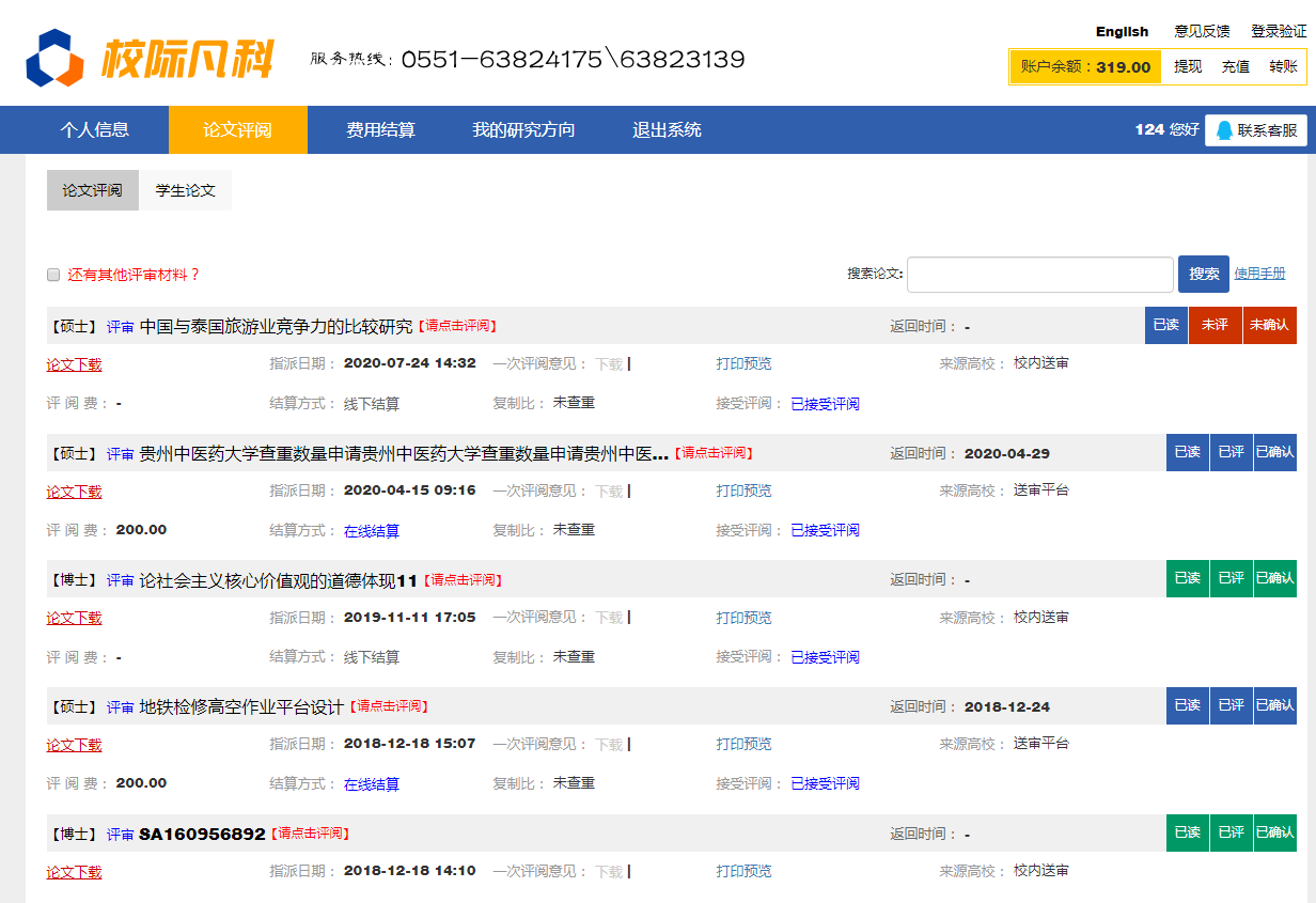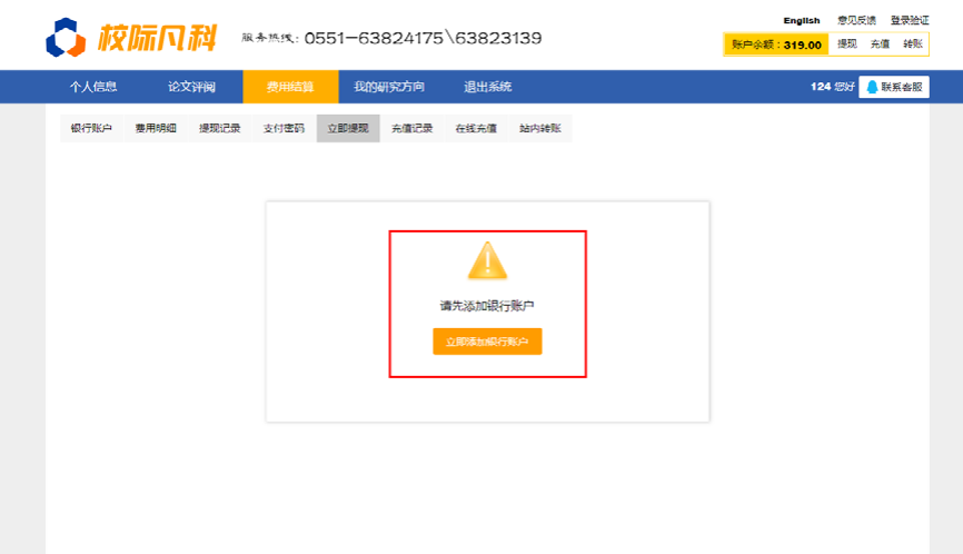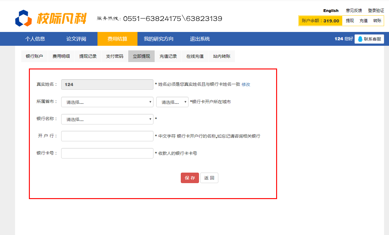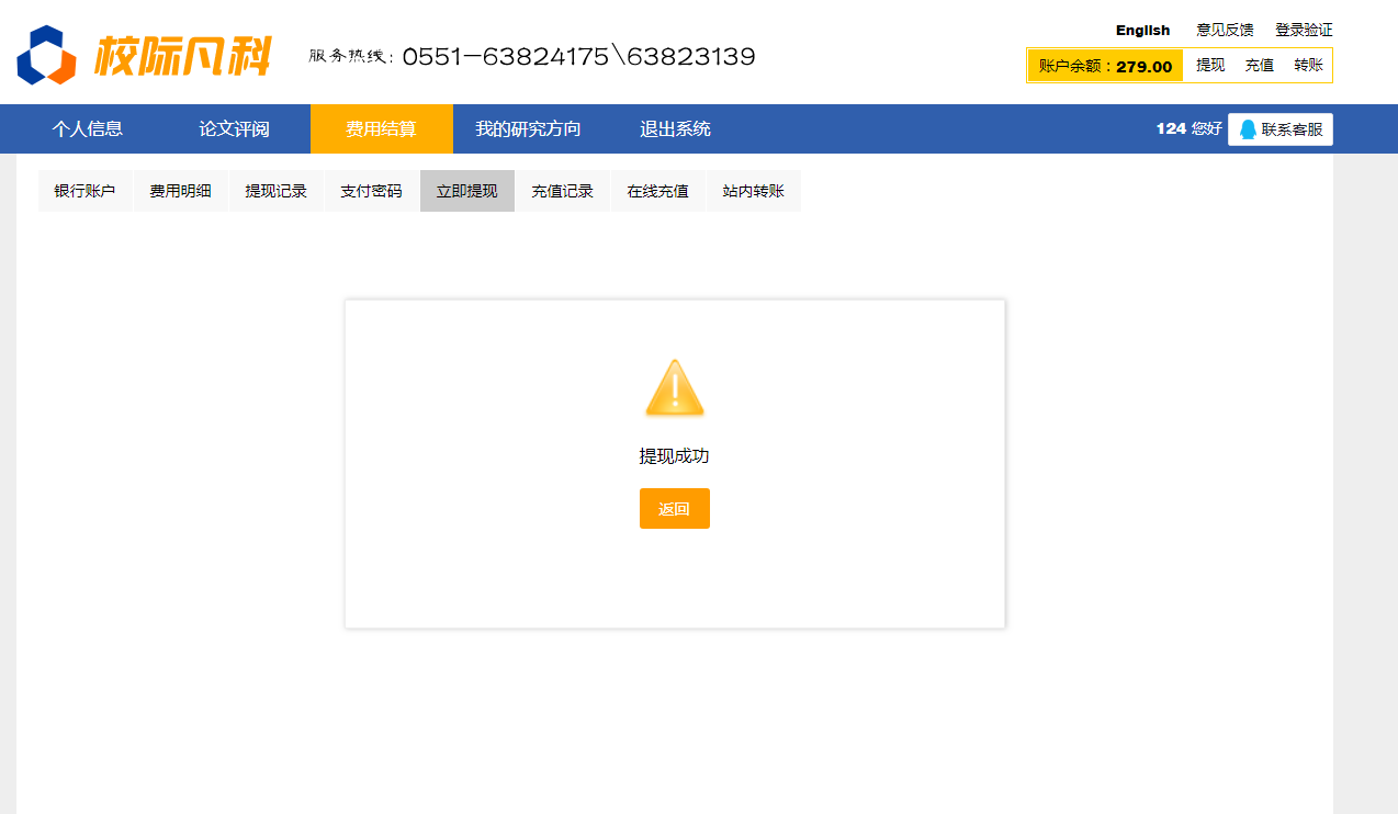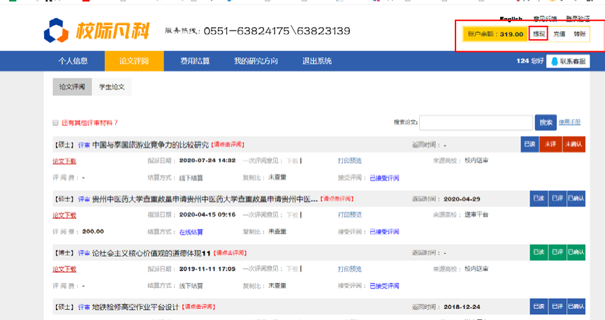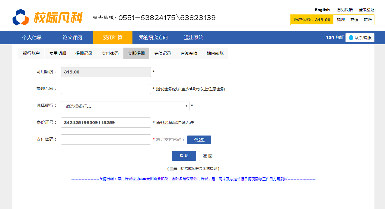 如果結算方式是線下結算或是校內送審的,請聯系學校秘書或是分給您論文的老師。 結算方式是“在線結算”的。您點“最終定稿”后,刷新平臺,您的賬戶余額會自動增加本篇論文的評審費。可在線提現(綁定銀行卡,設置支付密碼, <此處的支付密碼并不是您的銀<>行卡密碼,是您用于平臺提現設的密碼。用于后期提現用> );