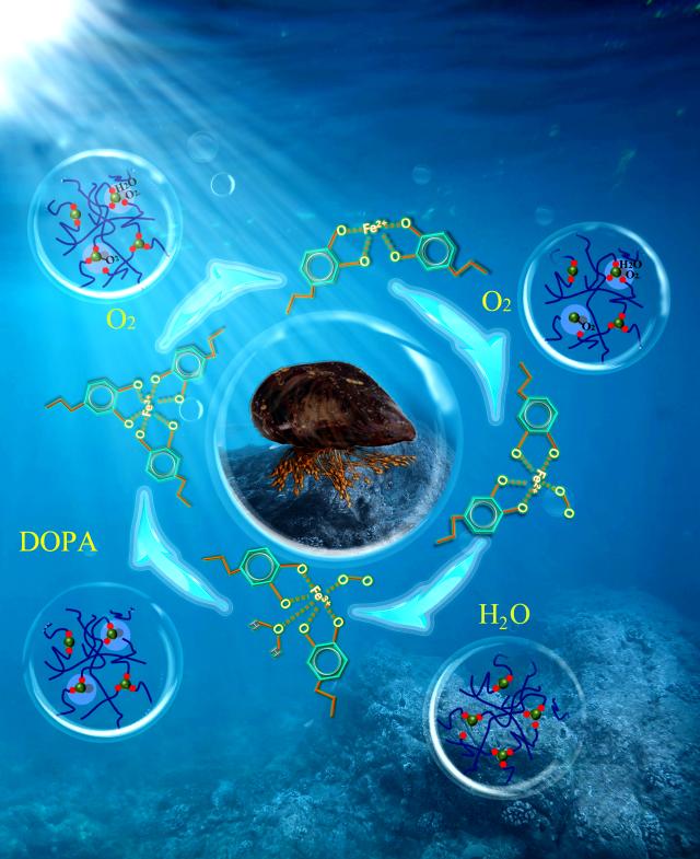 海洋貽貝足絲能使貽貝附著在堅硬的巖石表面抵御十級風暴,其作用機理在于連續基質與次微米大小顆粒夾雜的復合結構角質層。中國石油大學(北京)徐泉研究員與中國人民解放軍總醫院、清華大學、美國北德克薩斯州大學合作,揭示了貽貝足絲角質層內部左旋多巴胺與鐵離子動態敖合新機理及其角質層中鐵離子分布梯度分布規律。