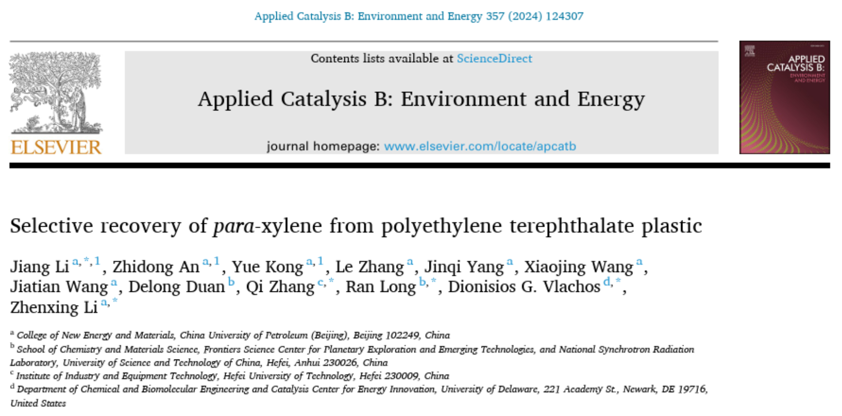 近日,在國家重點研發(fā)計劃,國家自然科學(xué)基金等支持下,中國石油大學(xué)(北京)新能源與材料學(xué)院李江副教授/李振興教授研究團隊聯(lián)合合肥工業(yè)大學(xué)張琪副教授,中國科學(xué)技術(shù)大學(xué)龍冉教授以及美國特拉華大學(xué)能源創(chuàng)新催化中心Dionisios G. Vlachos教授在塑料降解領(lǐng)域取得重要研究進展。團隊發(fā)展了一種高選擇性RuFe雙金屬催化劑用于一種PET的模型化合物DMT和實際PET塑料的加氫脫氧過程,成果發(fā)表在《Applied Catalysis B: Environment and Energy》上(Appl. Catal. B Environ., 2024, 357, 124307),題目為:“Selective recovery of para-xylene from polyethylene terephthalate plastic”。論文第一作者為新能源與材料學(xué)院李江副教授,新能源與材料學(xué)院博士研究生安志東和碩士研究生孔悅為共同第一作者,中國石油大學(xué)(北京)為第一完成單位。