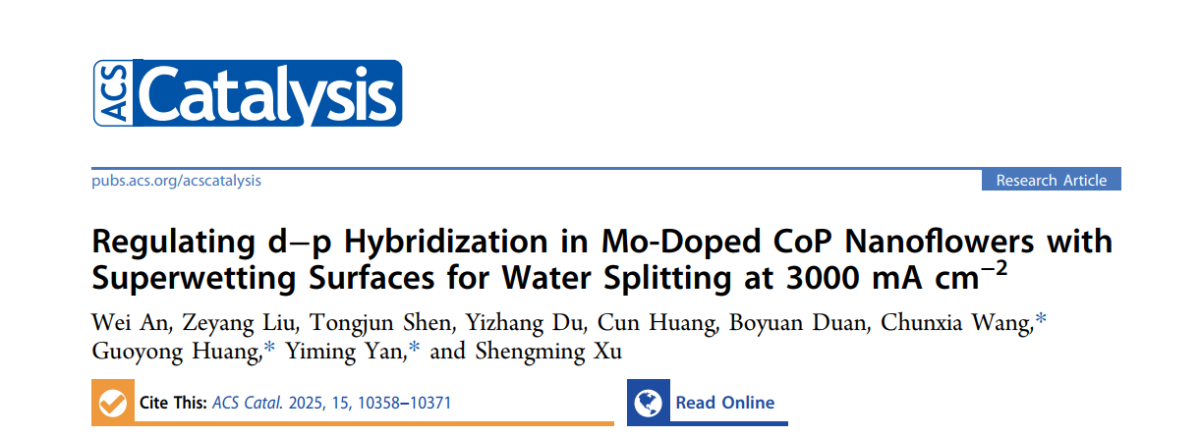 近日,在國(guó)家重點(diǎn)研發(fā)計(jì)劃,國(guó)家自然科學(xué)基金支持下,中國(guó)石油大學(xué)(北京)新能源與材料學(xué)院黃國(guó)勇教授/王春霞副教授聯(lián)合北京化工大學(xué)嚴(yán)乙銘教授,在ACS Catalysis期刊發(fā)表題目為《Regulating d?p Hybridization in Mo-Doped CoP Nanoflowers with Superwetting Surfaces for Water Splitting at 3000 mA cm-2》的研究論文。論文第一作者為新能源與材料學(xué)院碩士生安瑋,中國(guó)石油大學(xué)(北京)為第一完成單位。