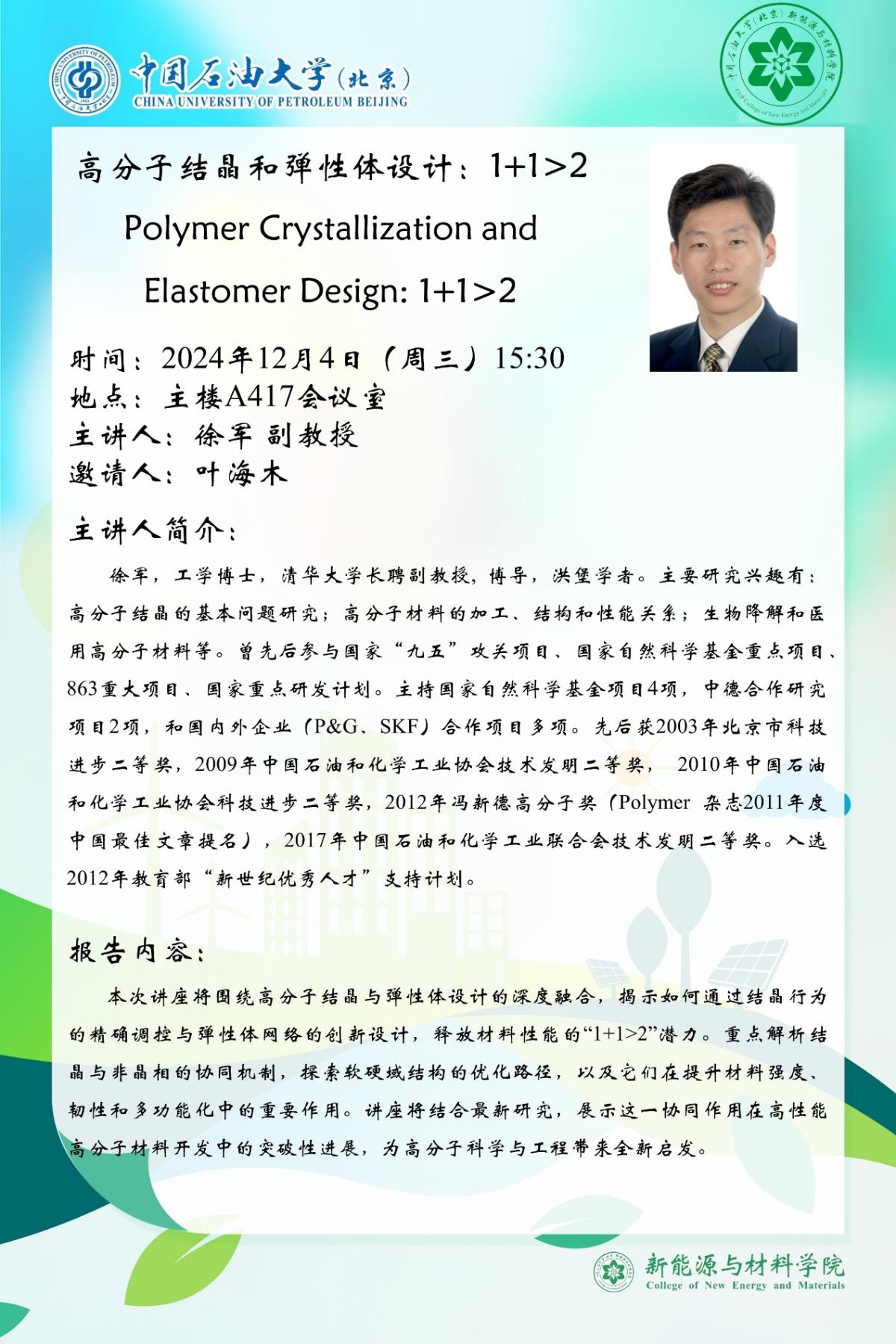 本次講座將圍繞高分子結晶與彈性體設計的深度融合,揭示如何通過結晶行為的精確調控與彈性體網絡的創新設計,釋放材料性能的“1+1>2”潛力。重點解析結晶與非晶相的協同機制,探索軟硬域結構的優化路徑,以及它們在提升材料強度、韌性和多功能化中的重要作用。講座將結合最新研究,展示這一協同作用在高性能高分子材料開發中的突破性進展,為高分子科學與工程帶來全新啟發。