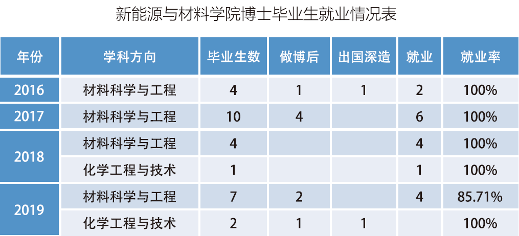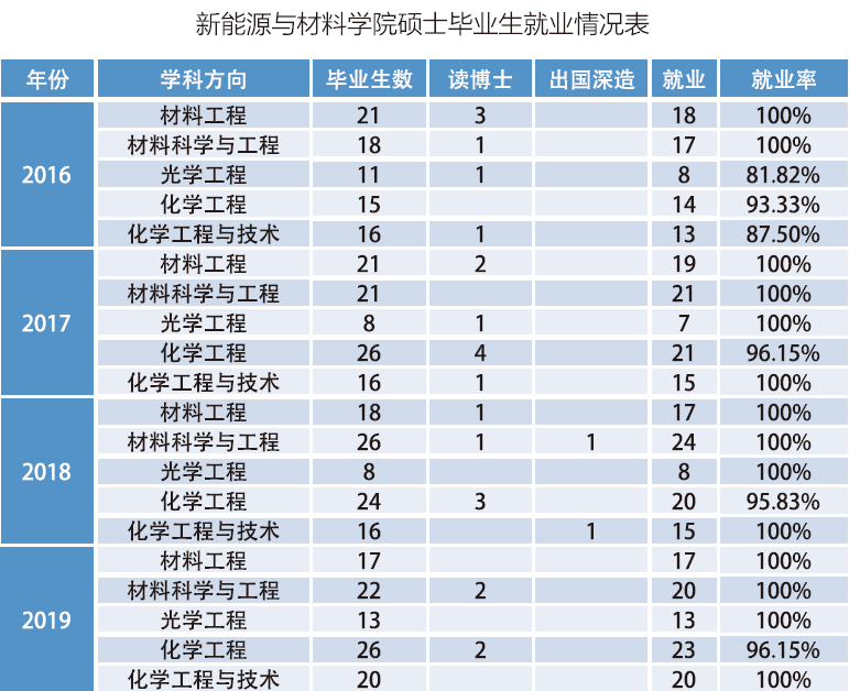 材料專業(yè)和新能源專業(yè)均是寬口徑專業(yè),畢業(yè)生需求量大,可工作領(lǐng)域廣,主要集中在國(guó)有企業(yè)和高校科研院所從事生產(chǎn)研發(fā)、運(yùn)行管理等工作。在多年來(lái),材料專業(yè)和新能源專業(yè)畢業(yè)生就業(yè)形勢(shì)良好,就業(yè)率保持較高比例。具體數(shù)據(jù)如下。