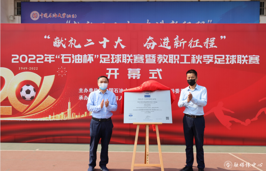 近日,學?!矮I禮二十大,奮進新征程”2022年“石油杯”足球聯賽暨教職工秋季足球聯賽在紅旗操場開幕。中石大副校長張廣清和體育與人文藝術學院負責人共同為紅旗操場國際足聯認證證書揭牌。師生足球友誼賽也火熱開賽。