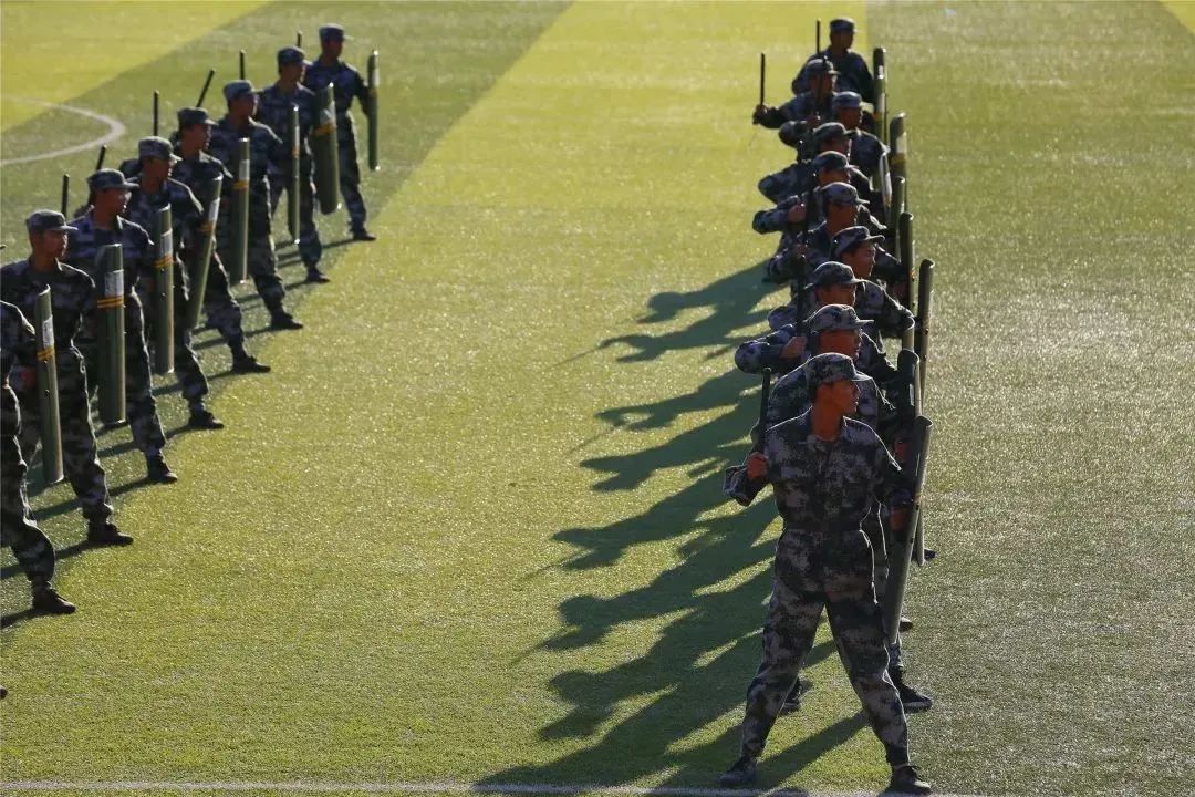 在克拉瑪依校區的紅旗操場上新生認真參加入學軍訓