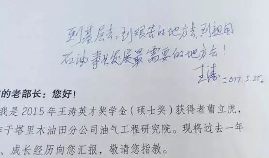 曹立虎至今保留著原石油工業部部長王濤給他的寄語:“2015年,我獲得王濤英才獎學金,老部長鼓勵我到新疆塔里木去。工作兩年后,給老部長寫信匯報工作,老部長給我寫了寄語‘到基層去,到艱苦的地方去,到祖國石油事業發展最需要的地方去’!”