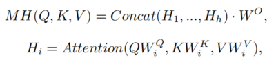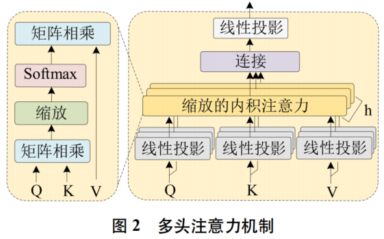 圖2給出了多頭注意力機制的細節,將對每個不同的注意力頭進行組合,并采用線性映射來得到多頭注意力值,公式化表示為: