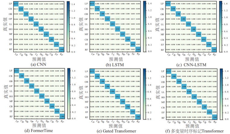 不同算法在四種不同評價指標上的對比結果呈現在表1中。從表1中可以看出 CNN和LSTM 的表現略差于 CNN-LSTM 的綜合表現,這表明在 CNN 特征提取的基礎上融合LSTM 時序依賴特征提取的效果更好。此外,兩種用于處理多變量時間序列分類的 Transformer 變體方法 FormerTime 和Gated-Transformer 均呈現出優于上述三種方法的表現,表明 Transformer 相比傳統深度學習方法(CNN和 LSTM 等)在長時依賴特征提取方面更具優勢。更重要的觀察是,所提方法的綜合表現優于所有對比方法,表明所提方法中設計的多變量時序標記策略更適于處理在電潛泵故障診斷任務。