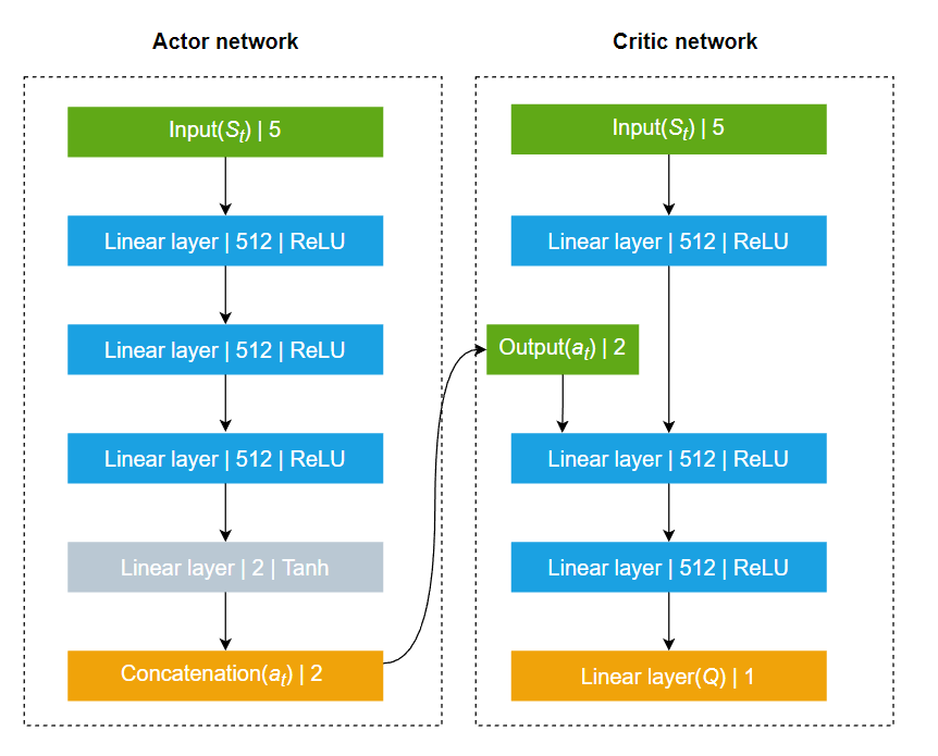 本文所建立的DDPG模型的輸入向量維度為5,為當前井眼軌跡井斜數據及預設井眼軌道數據。模型的輸出為作用于BHA的方位角和傾斜角。建立的DDPG模型的網絡結構如圖所示。