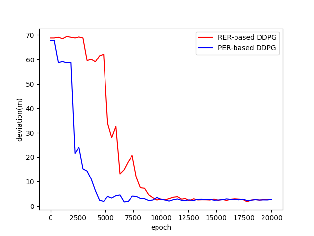 兩模型最終都能達到收斂,且收斂后的最大偏移距離基本一致,都在1.5米左右。但基于優先級經驗回放機制的DDPG模型的訓練效率明顯優于基于隨機經驗回放機制的DDPG模型。在本實驗中,基于優先級的經驗回放機制的訓練效率約為隨機經驗回放機制的兩倍。