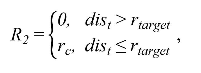獎勵R2是回合獎勵,其設置的目的是為了激勵智能體到達靶區,其計算公式如下: