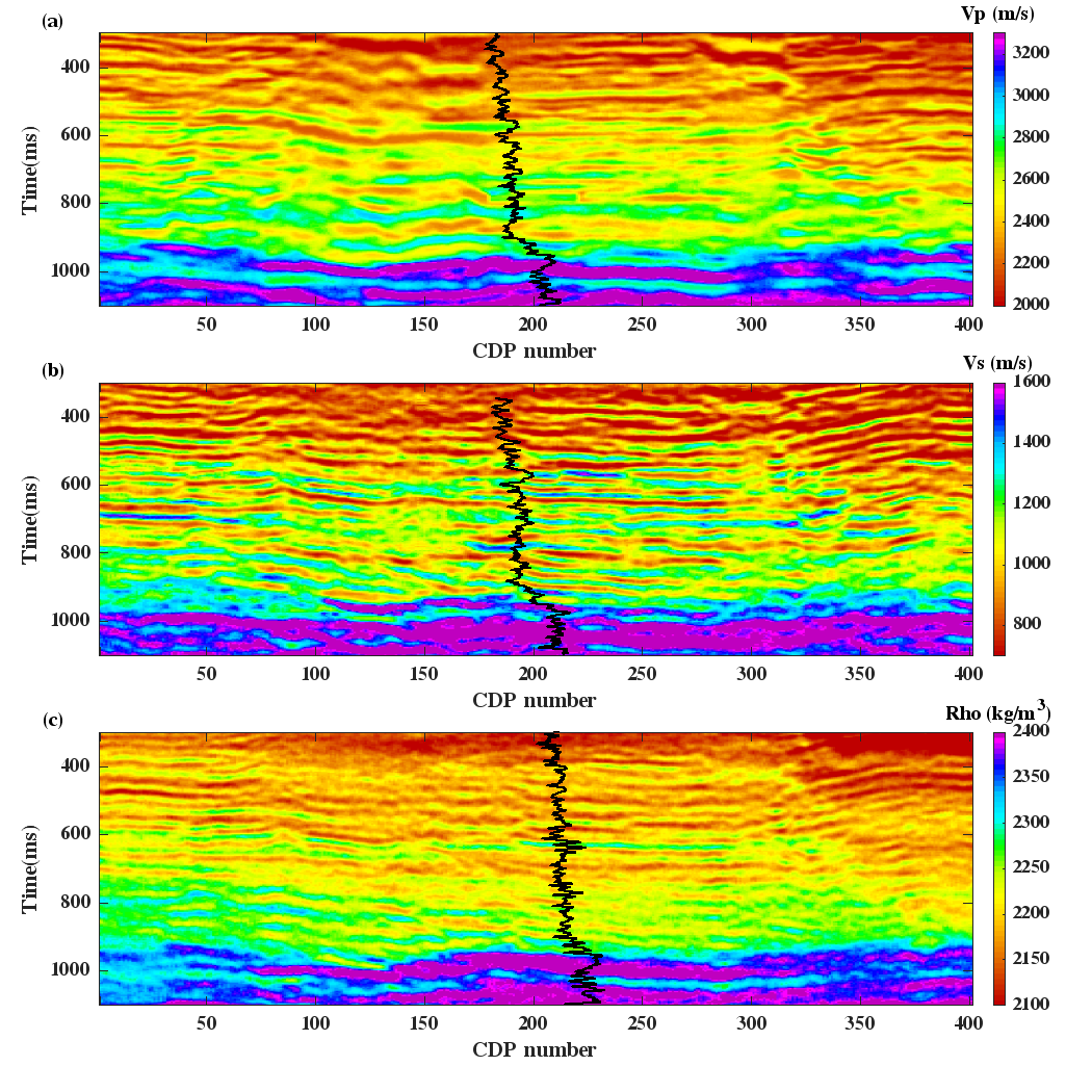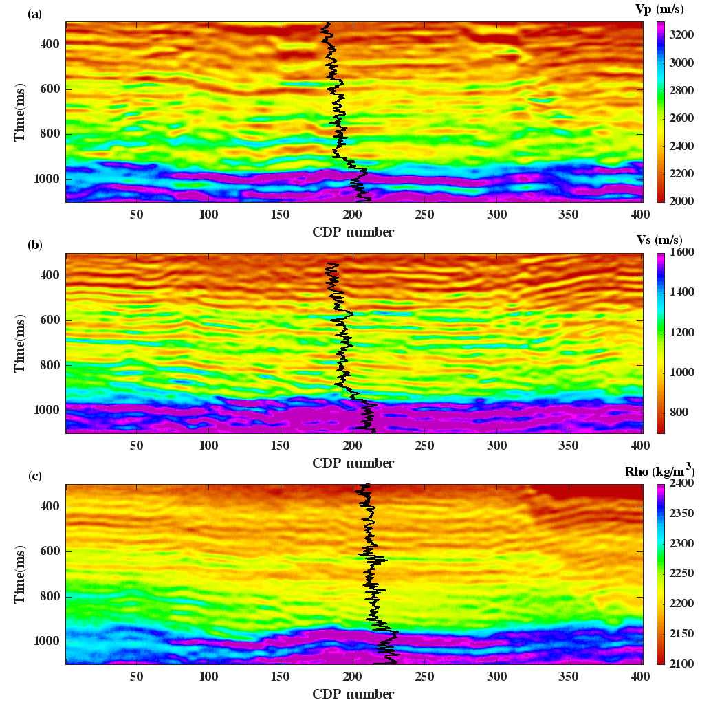 圖2-圖4所示為對來自中國東部某實際油田資料處理結果。分別對應基于L2范數正則化、L1范數正則化、振幅熵正則化的反演結果。每幅圖從上至下依次為縱波速度、橫波速度、密度反演結果;圖中黑線為對應第203道的測井曲線。從反演結果不難看出,基于L2范數正則化的反演結果分辨率較低,反演剖面較為模糊。基于L1范數正則化的反演結果分辨率有所提升,但仍不及基于熵正則化的反演結果,與前兩種正則化反演結果相比,基于熵正則化的反演結果分辨率較高,連續性較好,與測井曲線的變化趨勢也較為吻合,證明了本文提出算法的有效性和實用性。