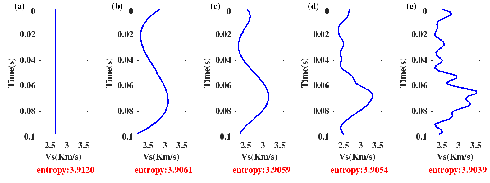 為了對于熵有一個更為直觀的理解,下圖展示了5種不同模型對應的幅度熵。其中,第一幅子圖中幅度為常數,我們難以從其中獲得有關于地質結構的任何信息,因此不確定性較大,熵值較大;反觀最后一幅子圖,其變化較為劇烈,我們可以獲得更多的地質信息,因此其熵值最小,不確定度最低。因此,采用振幅熵實現正則化可以降低反演的不確定性,提升反演穩定性和分辨率。