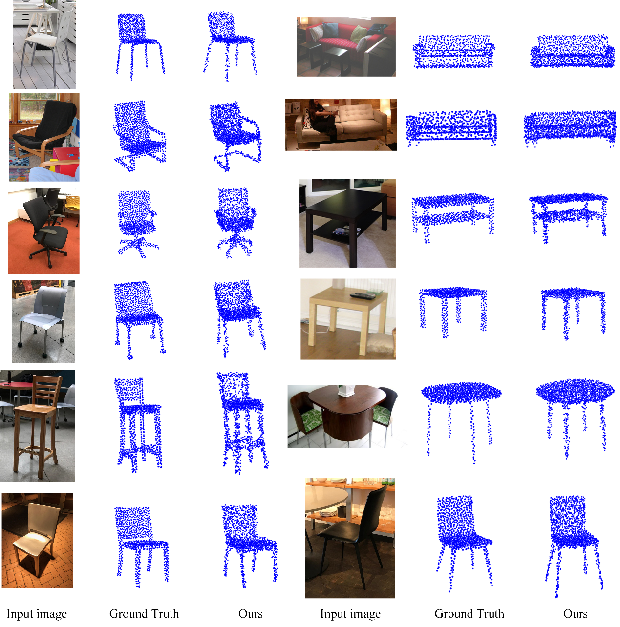 圖3為部分真實場景圖像的三維重建結(jié)果。可以看出,本文方法對于雙層結(jié)構(gòu)的桌子、椅子等復(fù)雜結(jié)構(gòu)的重建細節(jié)更加準確,能夠有效地保持點云模型形變局部拓撲結(jié)構(gòu)的一致性。