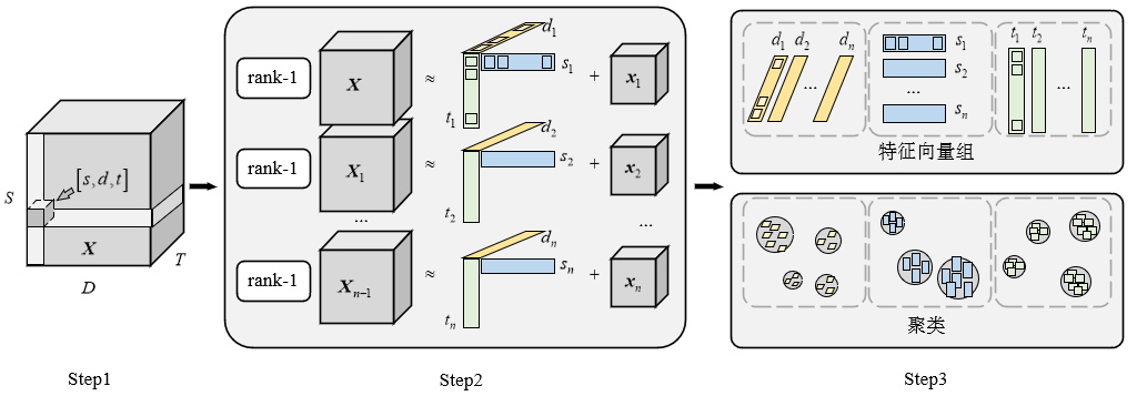 Step3,模式提取。通過連續(xù)秩1張量分解得到了多組低維向量,這些向量組都不同程度保留了原始三階張量的特征。將每個張量中包含的3個一維向量按不同維度進(jìn)行劃分,得到描述不同維度特征的特征向量組。通過聚類方法對特征向量組進(jìn)行聚類,可以得到綜合參數(shù)在不同維度上更詳細(xì)的時空模式。