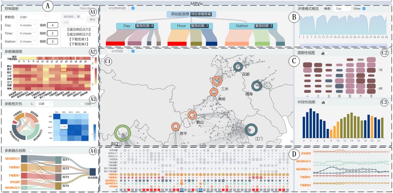 面向成品油管道歷史運(yùn)行的多參數(shù)數(shù)據(jù),本文提出一種基于多參數(shù)融合的張量分解方法,用于提取歷史數(shù)據(jù)中蘊(yùn)含的時空模式,并從多參數(shù)分組融合、時空模式提取及可視化、原始多參數(shù)對比分析等角度設(shè)計了可視化系統(tǒng)MPVis。該分析方法及分析流程可以進(jìn)一步應(yīng)用到其他更廣泛的工業(yè)過程領(lǐng)域,為多參數(shù)綜合表征的時空模式提取與分析提供了有力支持。