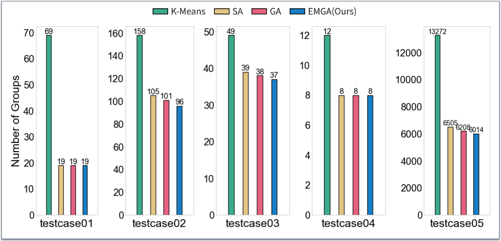 如上圖實(shí)驗(yàn)結(jié)果所示,與其他方法比較,EMGA在最為關(guān)注的分組質(zhì)量方面表現(xiàn)最好。EMGA結(jié)合了貪心算法和遺傳算法的優(yōu)勢(shì)。它能快速得到一個(gè)初始解,并且能夠通過(guò)改進(jìn)的遺傳算法維護(hù)一個(gè)多解集合,其中包含了搜索到的多個(gè)優(yōu)秀解。這些解之間可能存在一定的差異,提供了更多的選擇余地。這使得我們的算法比樸素的遺傳算法具有更好的性能。相比之下,模擬退火算法和K-Means算法更容易受局部搜索的限制,可能陷入局部最優(yōu)解。模擬退火算法相對(duì)較容易陷入某個(gè)解附近,導(dǎo)致生成更多且相似的分組。K-Means算法本身傾向于找到局部最優(yōu)解而不是全局最優(yōu)解。