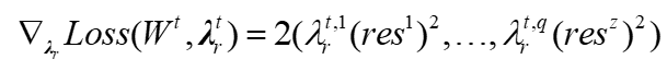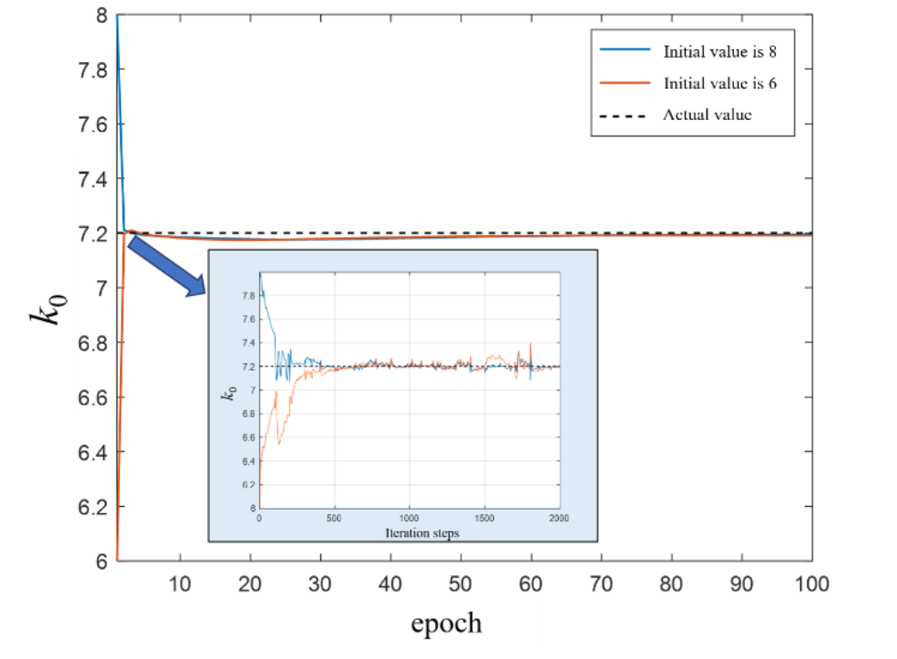 在機理模型的所有參數都是常數的情況下,通過網絡反向傳播,以計算損失函數對LSTM網絡的權重和殘差的權重的梯度。如下式所示,所提出的訓練方法的基本思想是在具有較大損失的區域中最大化相對于自適應權重的損失,并最小化相對于網絡權重的損失。