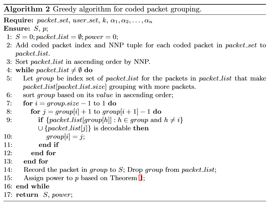 第二階段為PD-NOMA中的分組與功率分配策略。當所有編碼包生成后,基站將基于PD-NOMA對其進行調度并分配傳輸功率。即使在給定待傳輸?shù)臄?shù)據包的情況下,最小化傳輸時延仍可能是一個困難的問題。因此,我們提出了一種啟發(fā)式算法,先對數(shù)據包進行分組,然后分配傳輸功率。