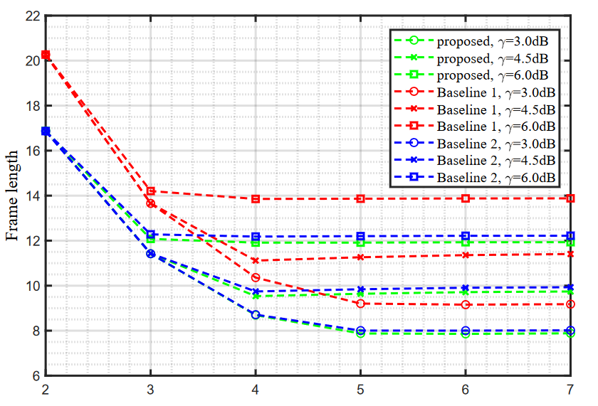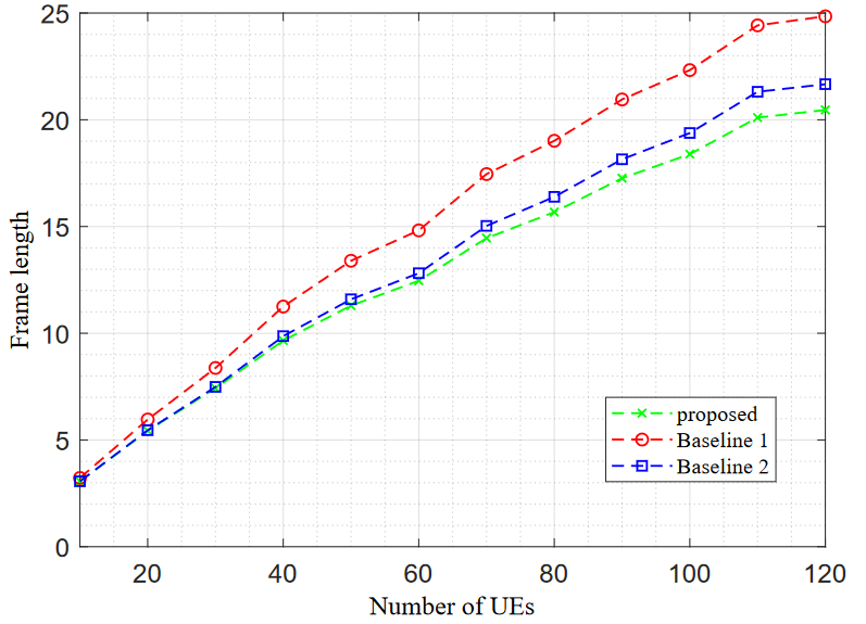 當n = 10時,所提出的算法和baseline1相較于baseline2,分別將幀長度減少了5.03%和4.9%。當n = 70時,這一比例分別上升至17.19%和13.91%。