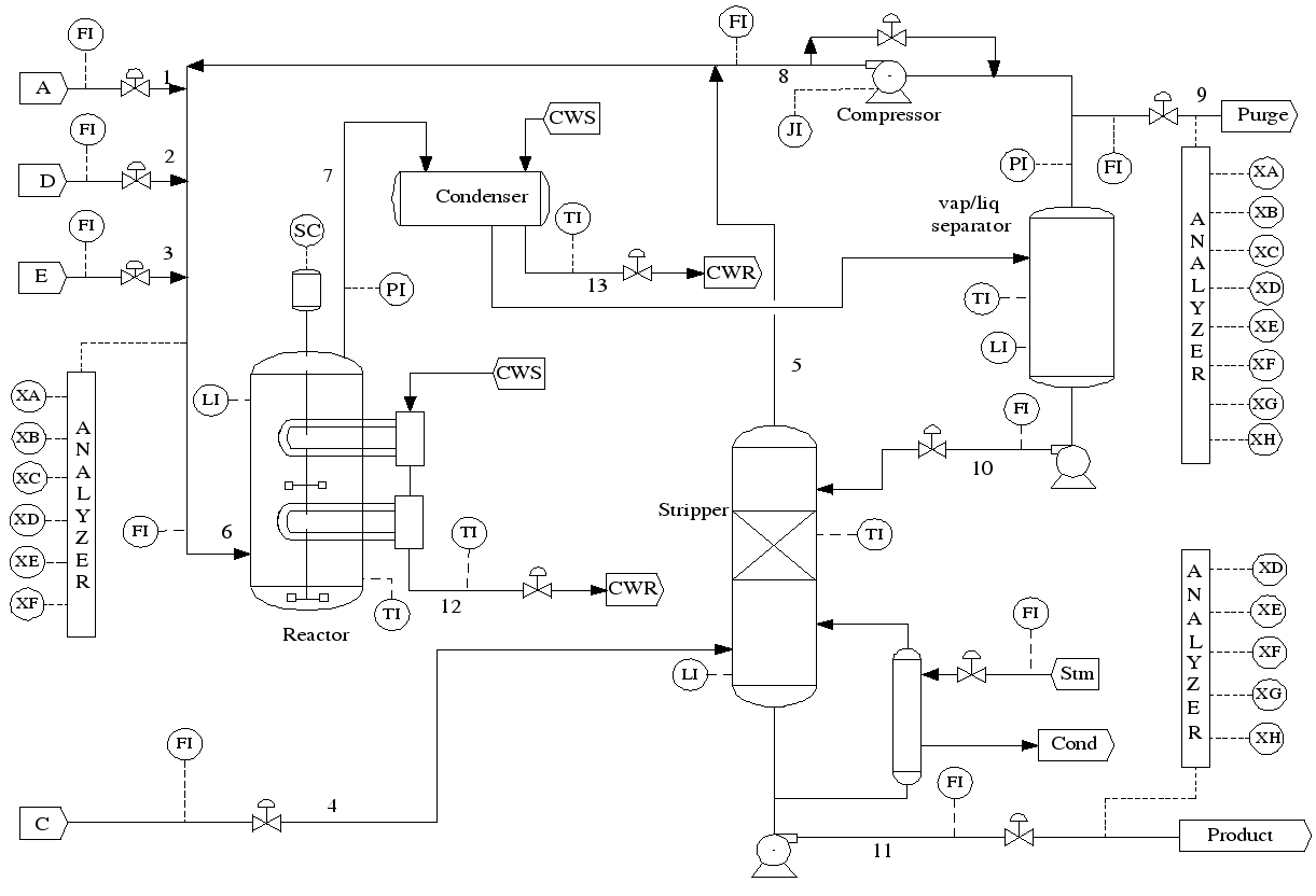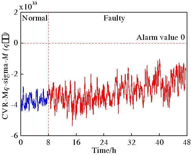 當(dāng)化工過程中發(fā)生初始故障時,一些變量會略微偏離初始軌跡,過程殘差會逐漸向均值的一側(cè)偏移,即發(fā)生過程變異。傳統(tǒng)的指標(biāo)對這種情況不夠敏感,或者以高誤報(bào)率為代價來實(shí)現(xiàn)它。為了解決這一問題并探索在動態(tài)過程中具有低誤報(bào)率的方法,首先通過規(guī)范變量分析生成規(guī)范變量殘差。然后,提出了一種新的多變量q-sigma規(guī)則來監(jiān)測規(guī)范變量殘差。它在一個窗口中考慮上述過程變異,并為每個變量設(shè)置控制限。當(dāng)在模擬過程中進(jìn)行測試時,多變量q-sigma對過程變化非常敏感,能夠比其他方法更早地檢測出初始故障,即檢測延遲和檢測距離最小。