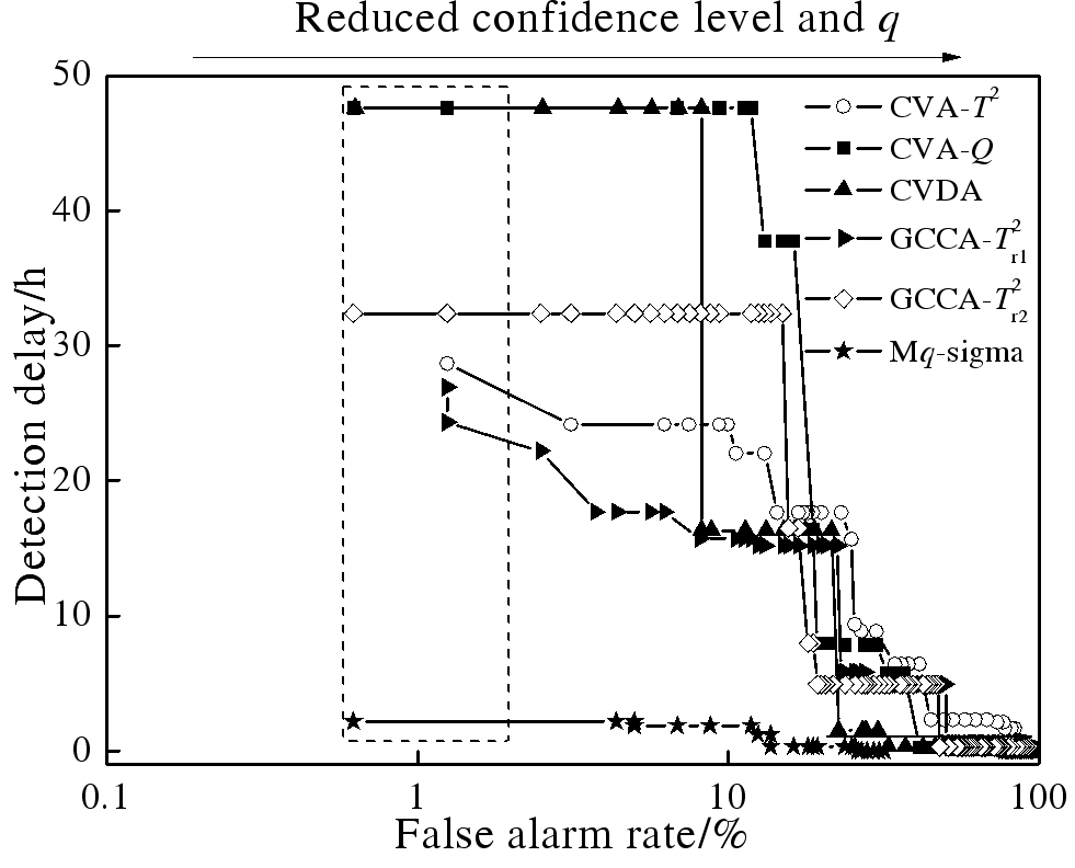 數(shù)值實(shí)驗(yàn)表明,本文提出的方法能最早地檢測出早期故障,且誤報(bào)率最低。結(jié)果還表明:(1)早期故障的過程變異主要分布在1-sigma到3-sigma之間或?1-sigma和?3-sigma之間,嚴(yán)重的過程變化分布在3-sigma或?3-sigma以外。(2) 傳統(tǒng)的方法側(cè)重于低誤報(bào)率,控制限較大,對早期故障不敏感。檢測延遲可以以高誤報(bào)率的代價降低。(3) 多變量q-sigma考慮每個變量的控制限值和幾個連續(xù)點(diǎn)的變化。它能以較低的誤報(bào)率實(shí)現(xiàn)早期檢測故障。