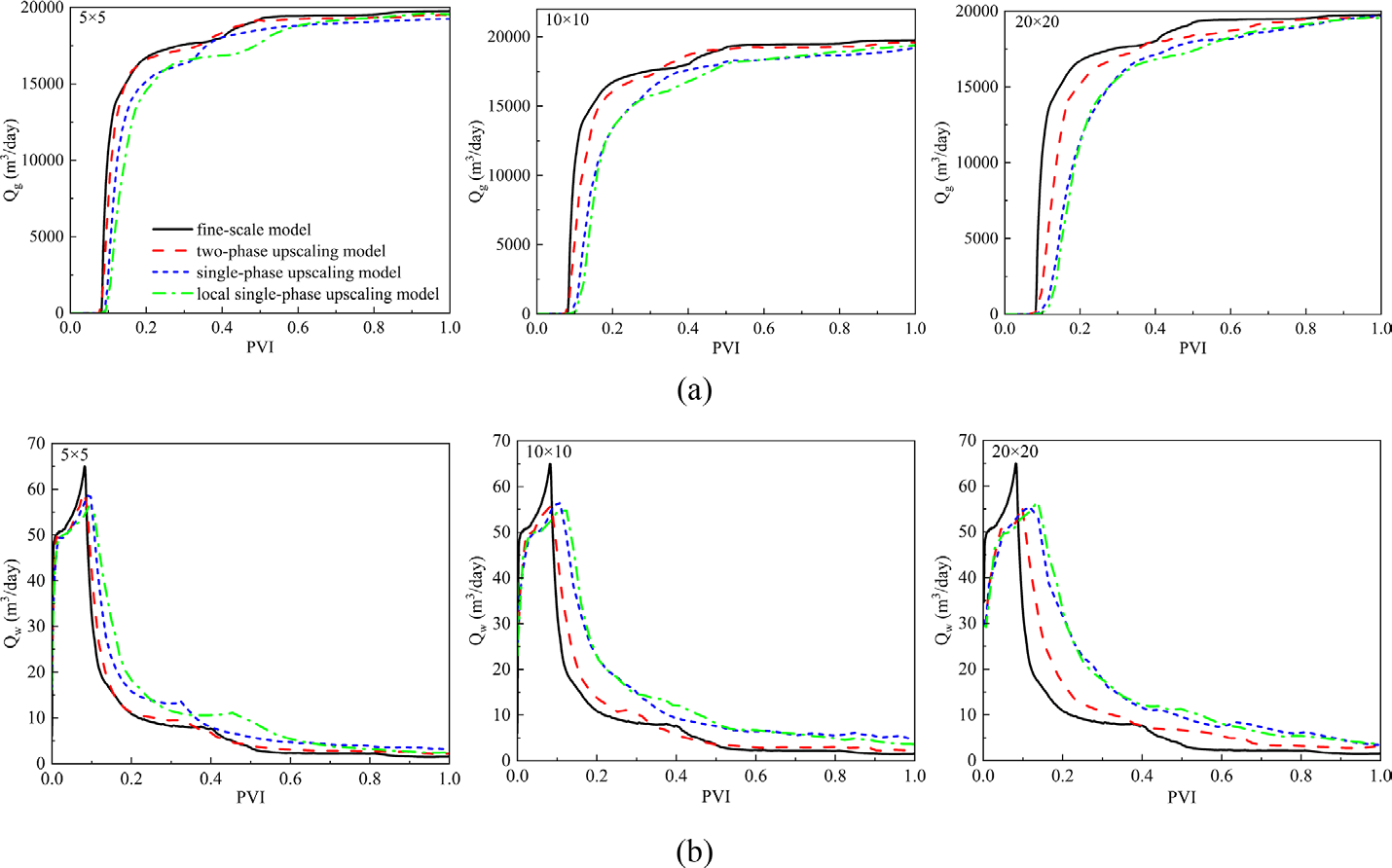 以圖1所示的滲透率場及井眼軌跡模型為例,對該模型分別按升尺度倍數(shù) 5×5、10×10 和 20×20 進行尺度升級計算。圖2展示了不同升尺度倍數(shù)下細尺度模型與粗尺度模型的結果對比。結果表明,本文提出的尺度升級算法(紅色虛線)在各個尺度下均與細尺度模型結果(黑色實線)最為接近,展現(xiàn)出較高的準確性。其中,局部單相尺度升級模型(綠色點劃線)為某商業(yè)軟件采用的尺度升級算法,本文提出的算法明顯比該商業(yè)軟件方案更為準確。