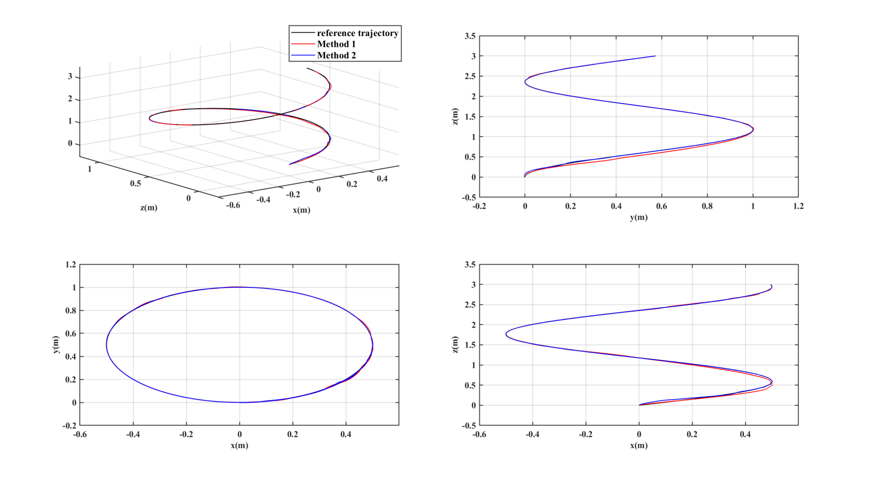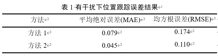 當AUV執行軌跡跟蹤任務時,在加入持續的不確定性海流干擾后,本文所提出的新方法2相比于方法1的抗干擾能力更強,初始階段偏離參考軌跡的幅度較小,且能在很短的時間快速地跟蹤上參考軌跡,而方法1的實際運行軌跡具有明顯的波動,抗干擾能力較差。