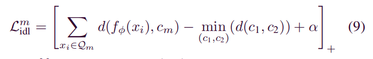 上方類間判別損失的計算方法是將錨點樣本的特征表示到類別原型的距離減去最小類間距離,并加上一個強迫的邊界。