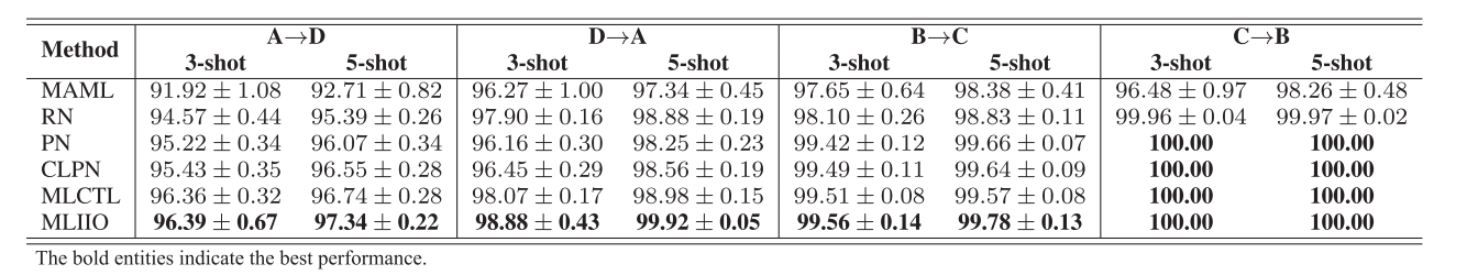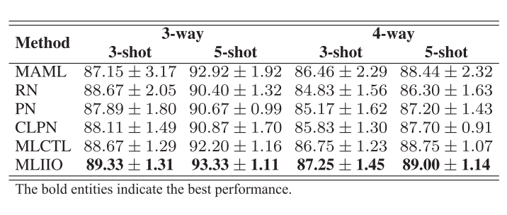 為驗證所提方法的有效性,在公開CWRU軸承數據集上對比了多種代表性方法(MAML、RN、PN、CLPN和MLCTL),結果表明所提出的元學習方法在小樣本故障診斷的平均診斷精度方面更加出色。在3-way 5-shot設置下,所有方法的平均診斷準確率超過了90%,這表明即使在樣本數量有限的情況下,MLIIO方法也能學習到有效的特征表示。在其他設置下,平均準確率也大多在80%到90%之間,顯示了該方法在少樣本學習問題上的魯棒性。