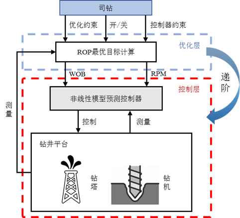 當前,隨著石油開采行業的不斷發展,石油開采工程逐漸向更為復雜的地層開展,合理的控制策略不可或缺。司鉆在鉆井時無法連續監測與調整控制過程,這將限制鉆井性能的提升,而鉆井參數的自動優化能改善這一情況。因此,設計鉆井系統時應考慮井底安全情況和參數自動優化。本文提出一種基于遞階結構的鉆井系統閉環優化控制策略。上層使用地層壓力窗口約束,在安全范圍內提升鉆井效率。下層針對鉆井系統的非線性特性,使用非線性模型預測控制作為先進控制器,精準控制井底壓力。上下層以遞階結構的形式構成閉環優化,保證鉆井性能的穩步改善。