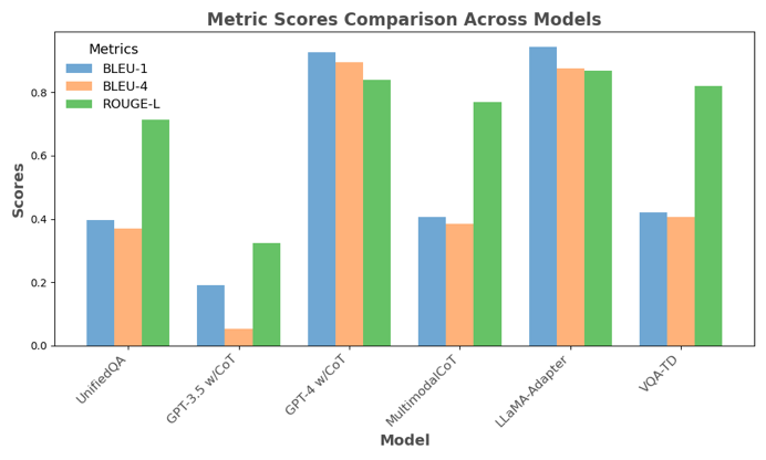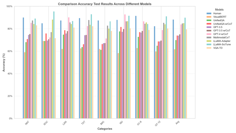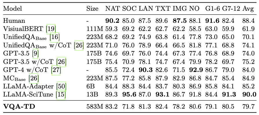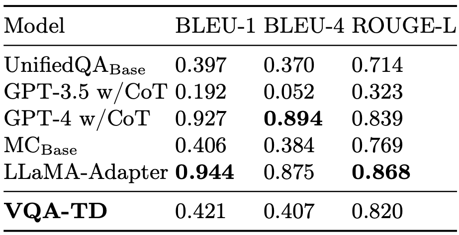 在ScienceQA數據集上的對比實驗表明,VQA-TD以GPT-3.5的1%參數量,在答案準確率和解釋文本生成質量上超過GPT-3.5;在部分任務上接近或超越Llama以及GPT-4。