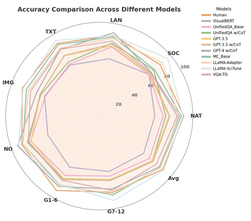 表1 對比試驗結果(NAT:自然科學;SOC:社會科學;LAN:語言科學;TXT:文本提示;IMG:圖像提示;NO:無提示;G1-6:1-6年級題目;G7-12:7-12年級題目)