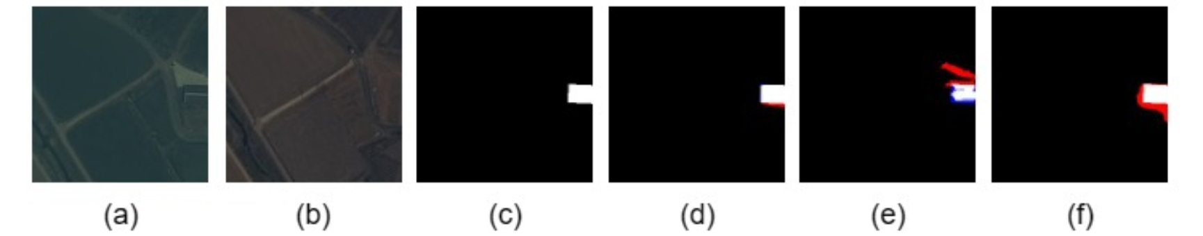 圖3 不同方法在BCDD、LEVIR、DSIFN和S2Looking數(shù)據(jù)集上的可視化結(jié)果。從上往下分別是BCDD、LEVIR、DSIFN和S2Looking;(a)變化前圖像,(b)變化后圖像,(c)變化真值圖,(d)CDMC的可視化結(jié)果,(e) SNUNet的可視化結(jié)果,(f) FC-SD的可視化結(jié)果